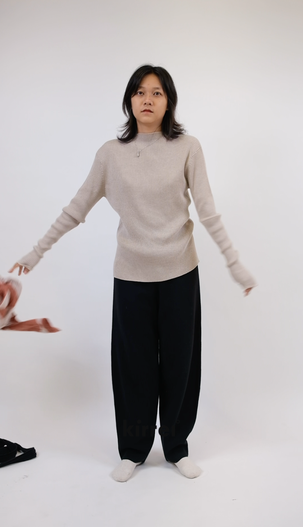 採用Cotton、Nylon、Silk 混紡的細緻紗線製成,材質帶有輕微絨面與溫潤的蠶絲光澤。使用2條紗線,採用15針Whole Garment針織機的規格織成,布料的設計採用羅紋織紋,追求彈性與柔順的垂墜表現。上衣的設計追求俐落、合身的輪廓,一體成型織出的上衣沒有經過縫製而平整無痕。
