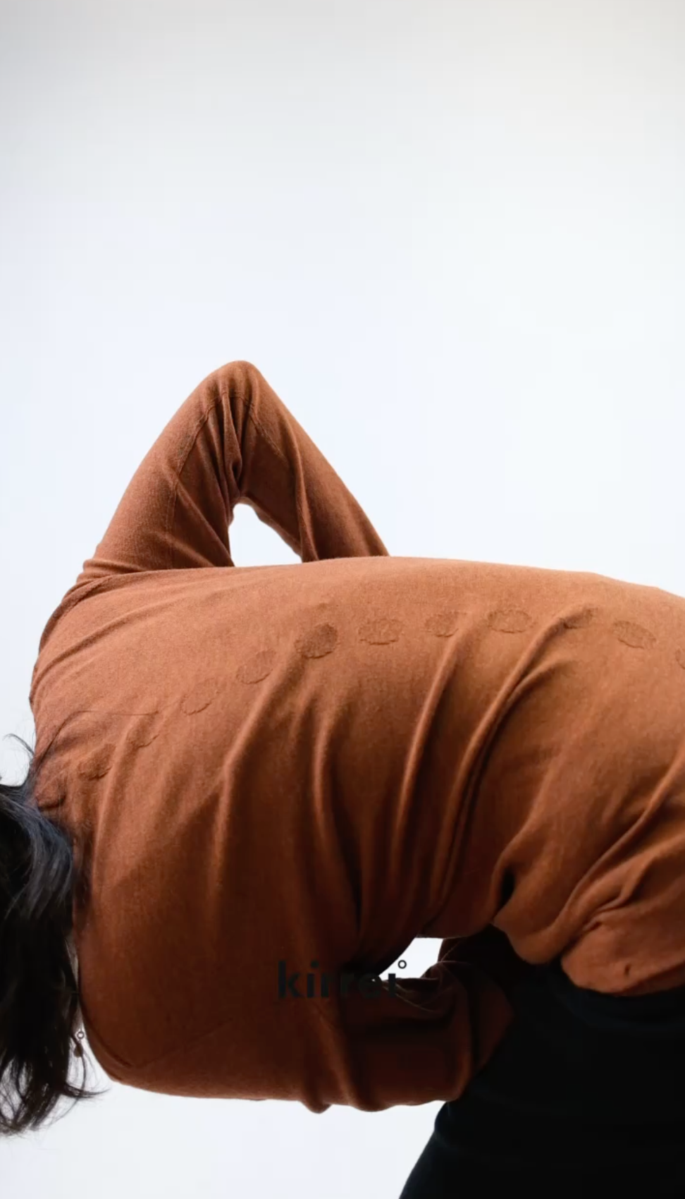 採用SUPIMA®Cotton 以及 Superfine Merino Wool混合而成的細緻紗線製成,長絨棉與16.5mic的羊毛混紡材質透氣、保暖且親柔如第二層肌膚。可機器洗滌容易照顧的材質,採用15針Whole Garment的規格織成,一體成型織出的上衣因為沒有經過縫製而平整無痕。版型合身,較長的袖子自然垂墜堆疊。背後設計與人體脊椎相呼應的紋理。材質有如第二層肌膚,適合貼身穿著。