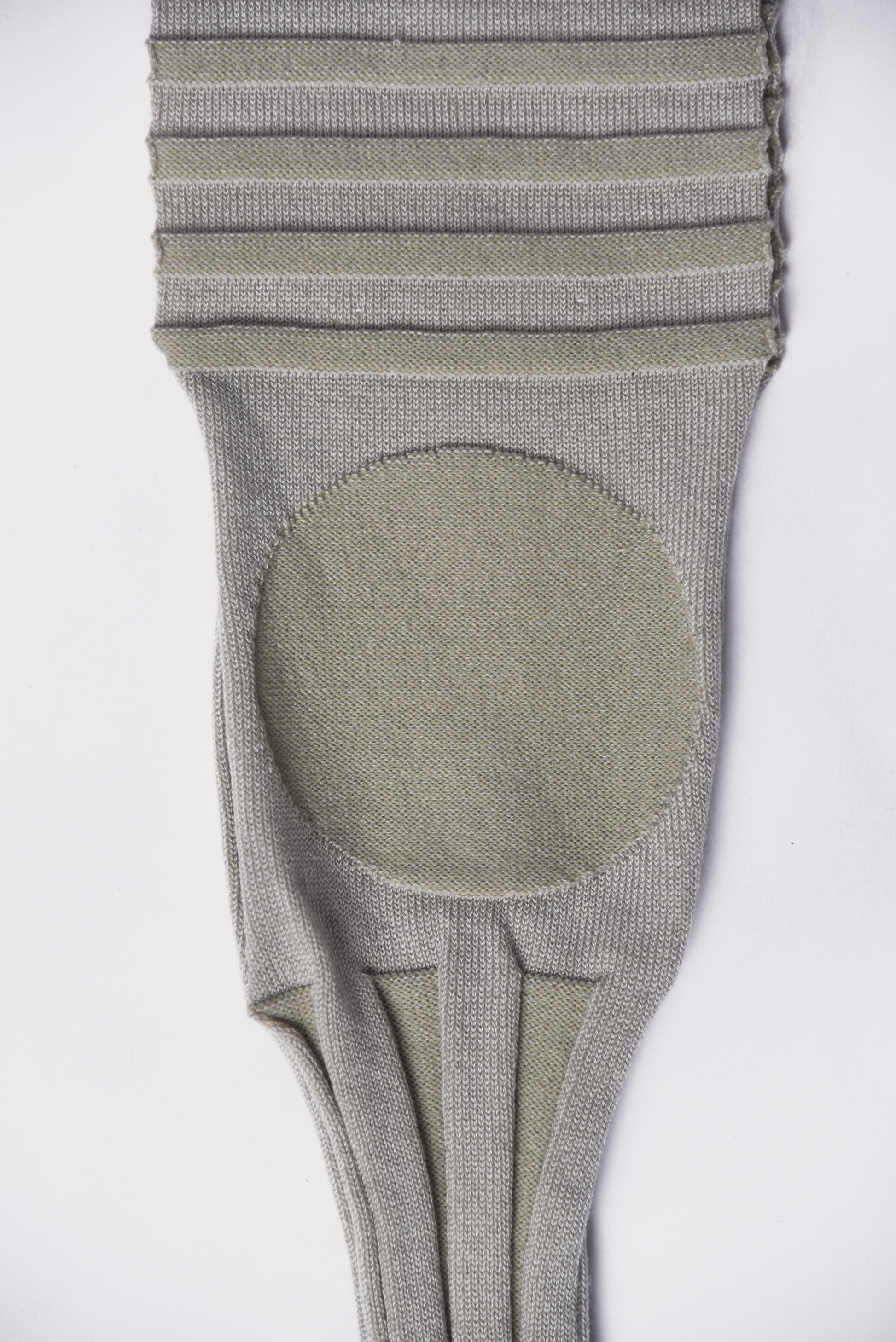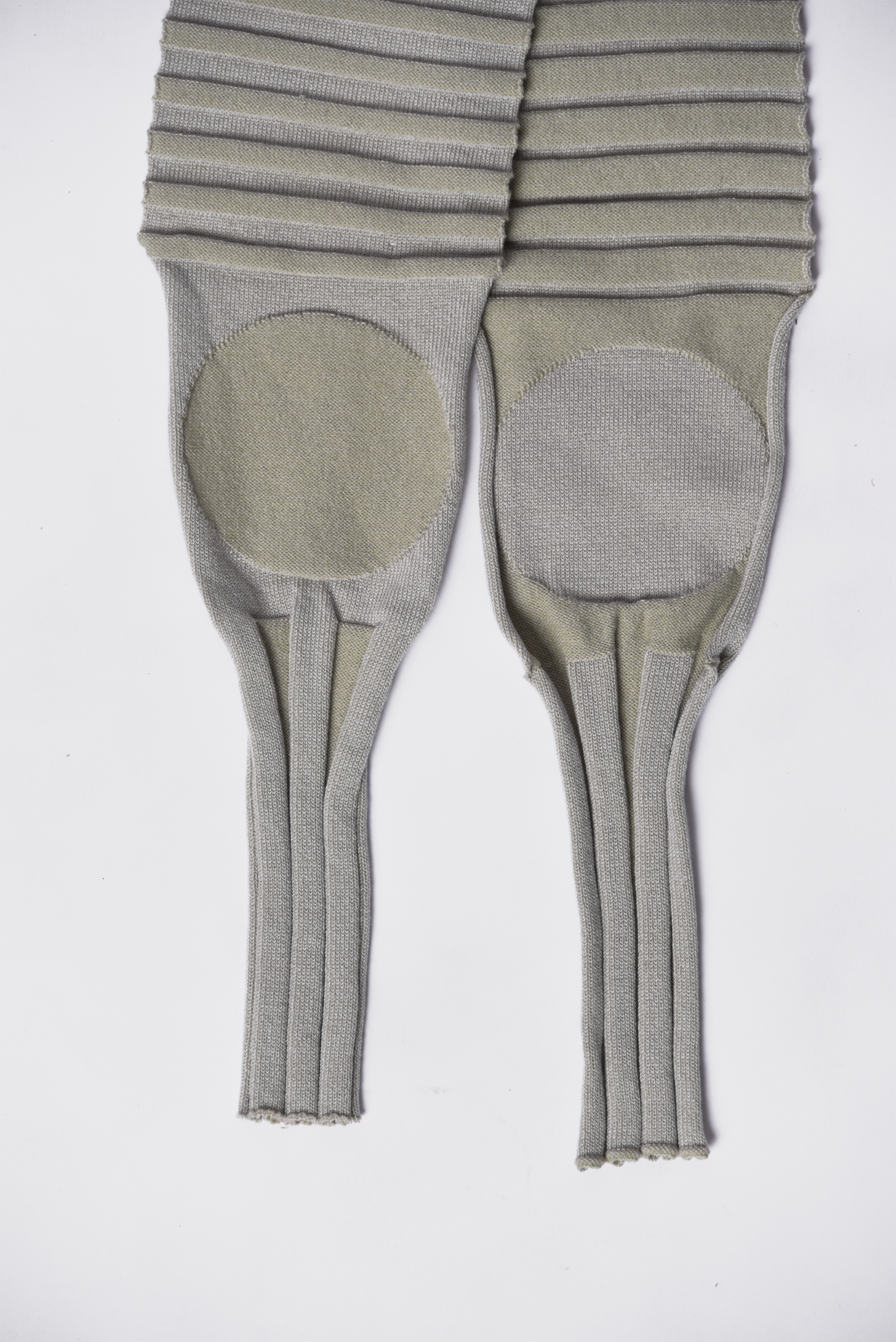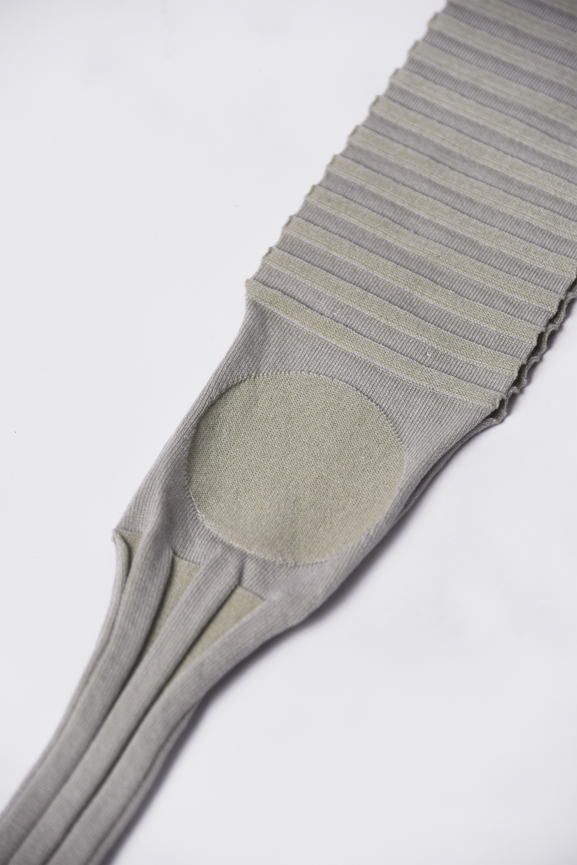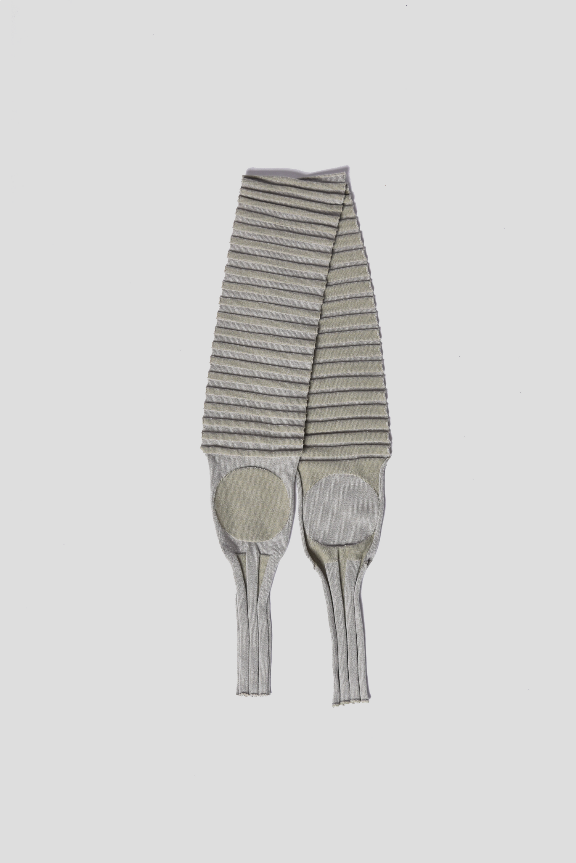 採用Lyocell的紗線製成,加入了蓬鬆的Nylon紗線,加厚了織出的布料。採用14針橫編針織機的規格織成,立體的紋理富有彈性。使用了plating的織造方式,使兩條異色的紗線色彩顯現在凹與凸的布料表面。收縮的兩端提供了搭配上的細節,適合當作領巾、髮帶、腰帶來使用。