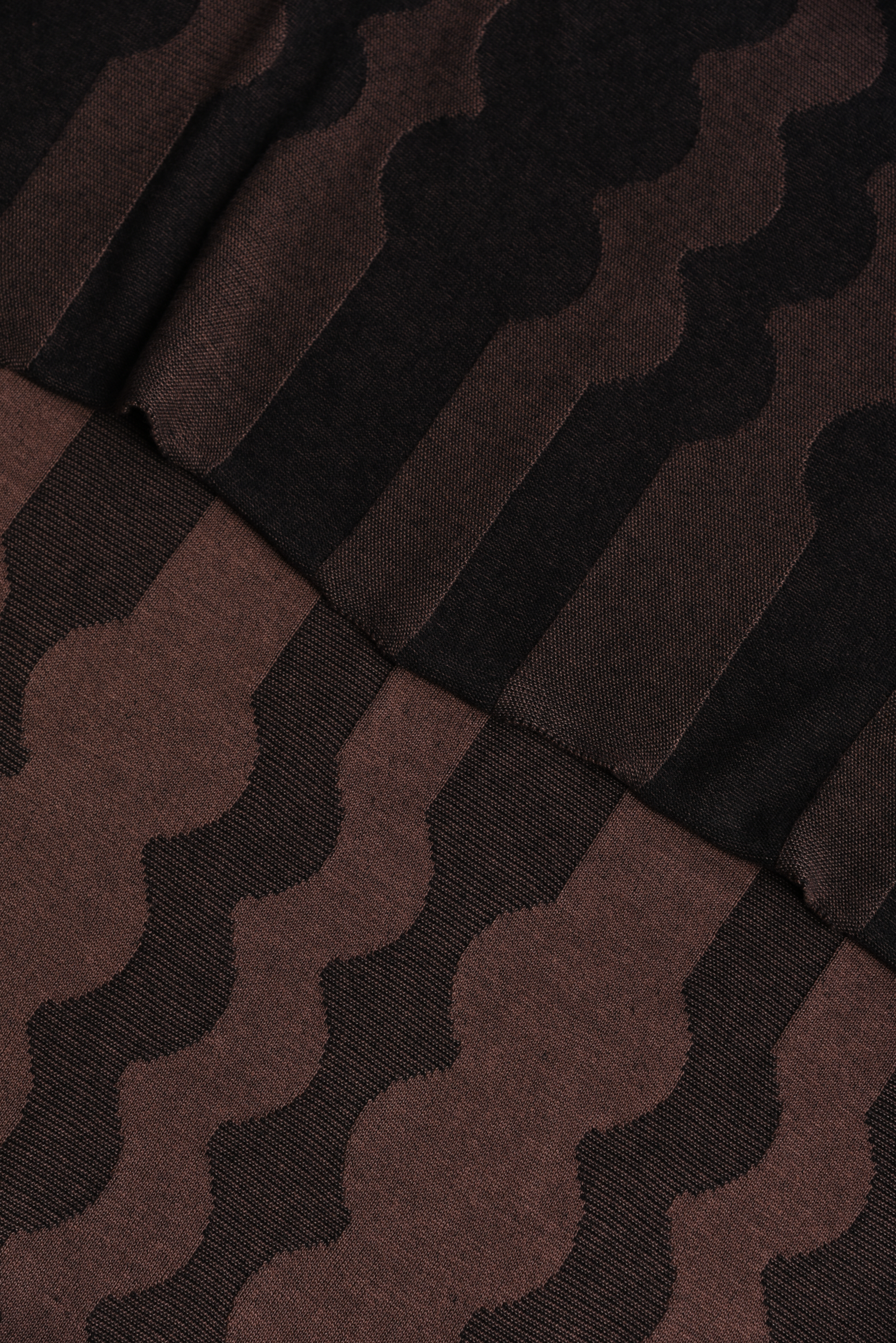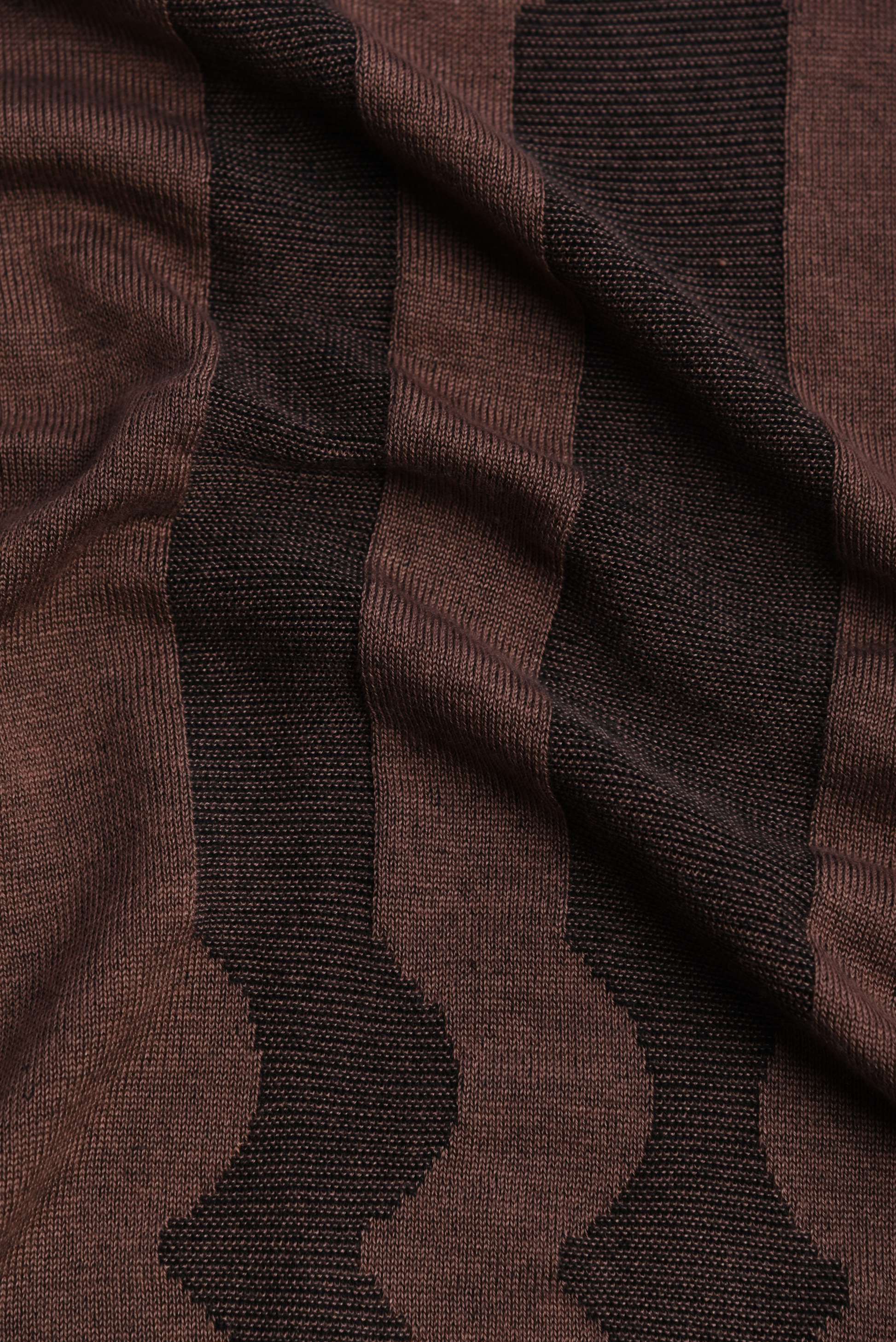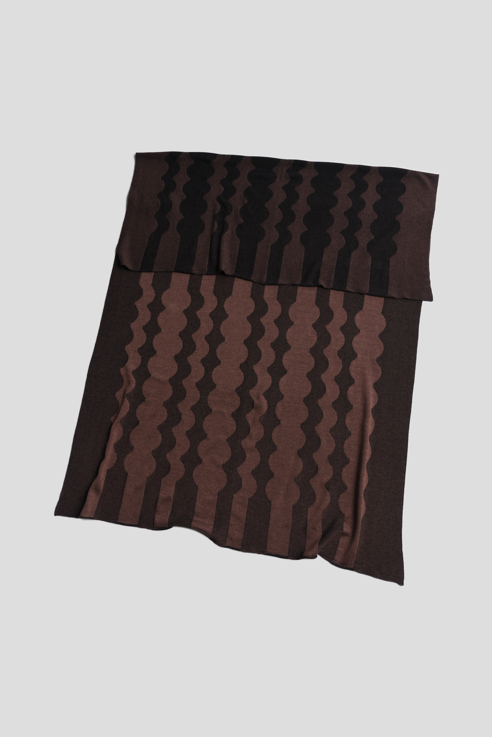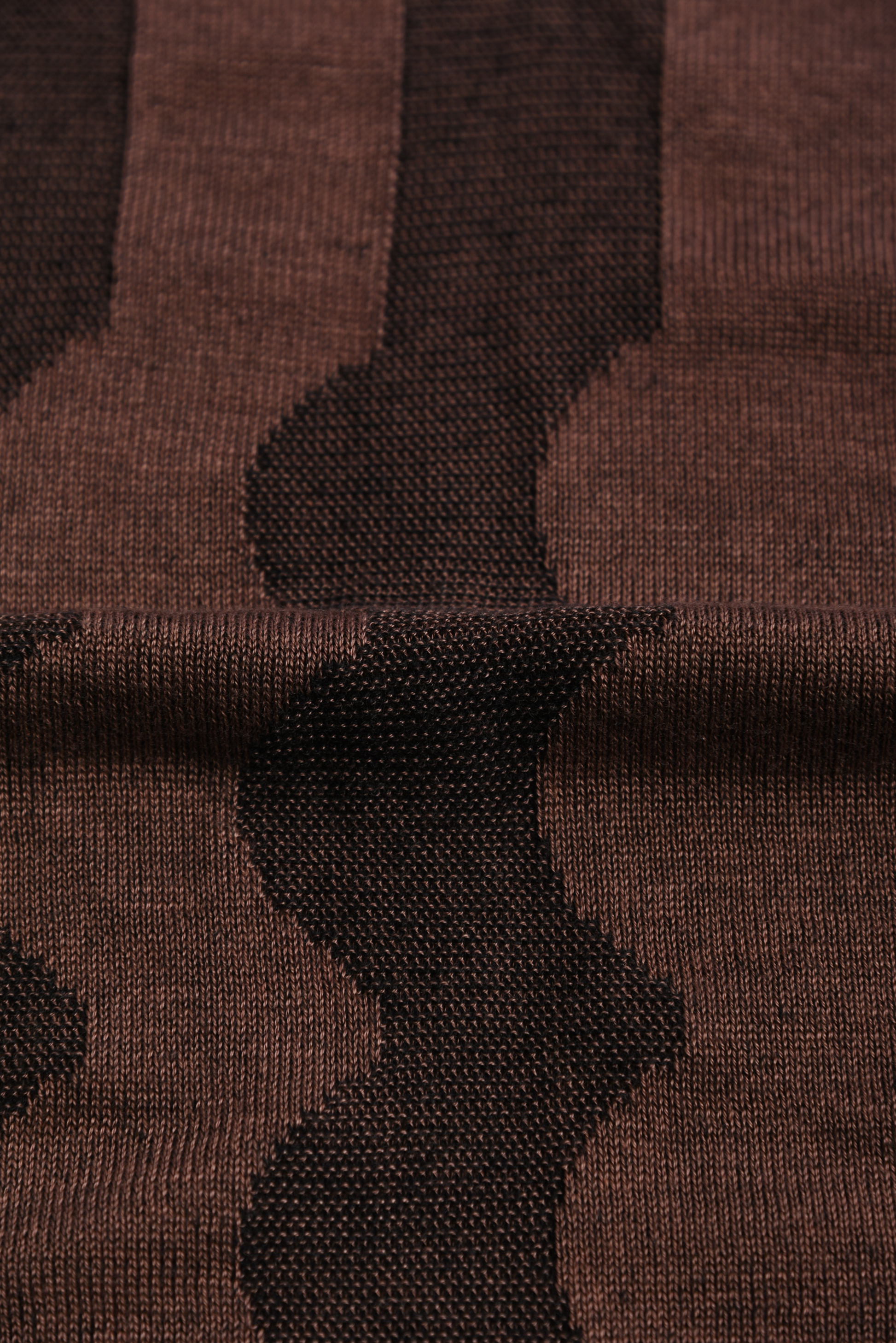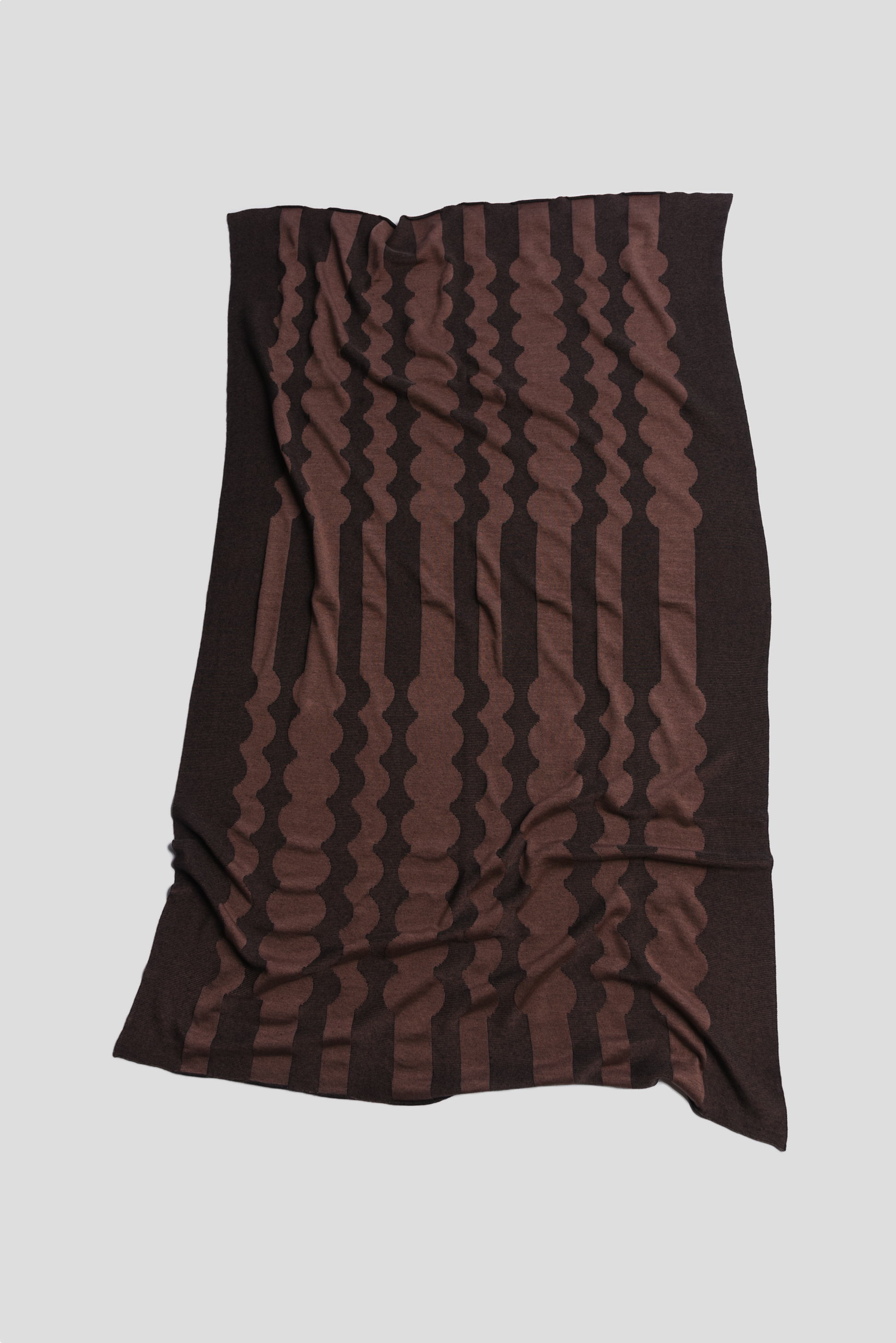 採用Cotton 與 Linen 混合而成的紗線以及Lyocell 與 Silk 混合而成的細緻紗線製成。 Lyocell & Silk 柔軟且帶有優雅溫潤的光澤,Cotton & Linen提供了乾爽的手感。 將兩種具有材質獨特性的紗線交織,取得柔軟與手感的平衡。 採用14針橫編針織機的規格織成,使用了plating的織造方式,使兩條異色的紗線色彩顯現在布料的正反面上,花紋則以布料的正反面交織呈現。 輕量、易打理的隨身毯尺寸,適合披掛於身上的同時也是居家用毯。