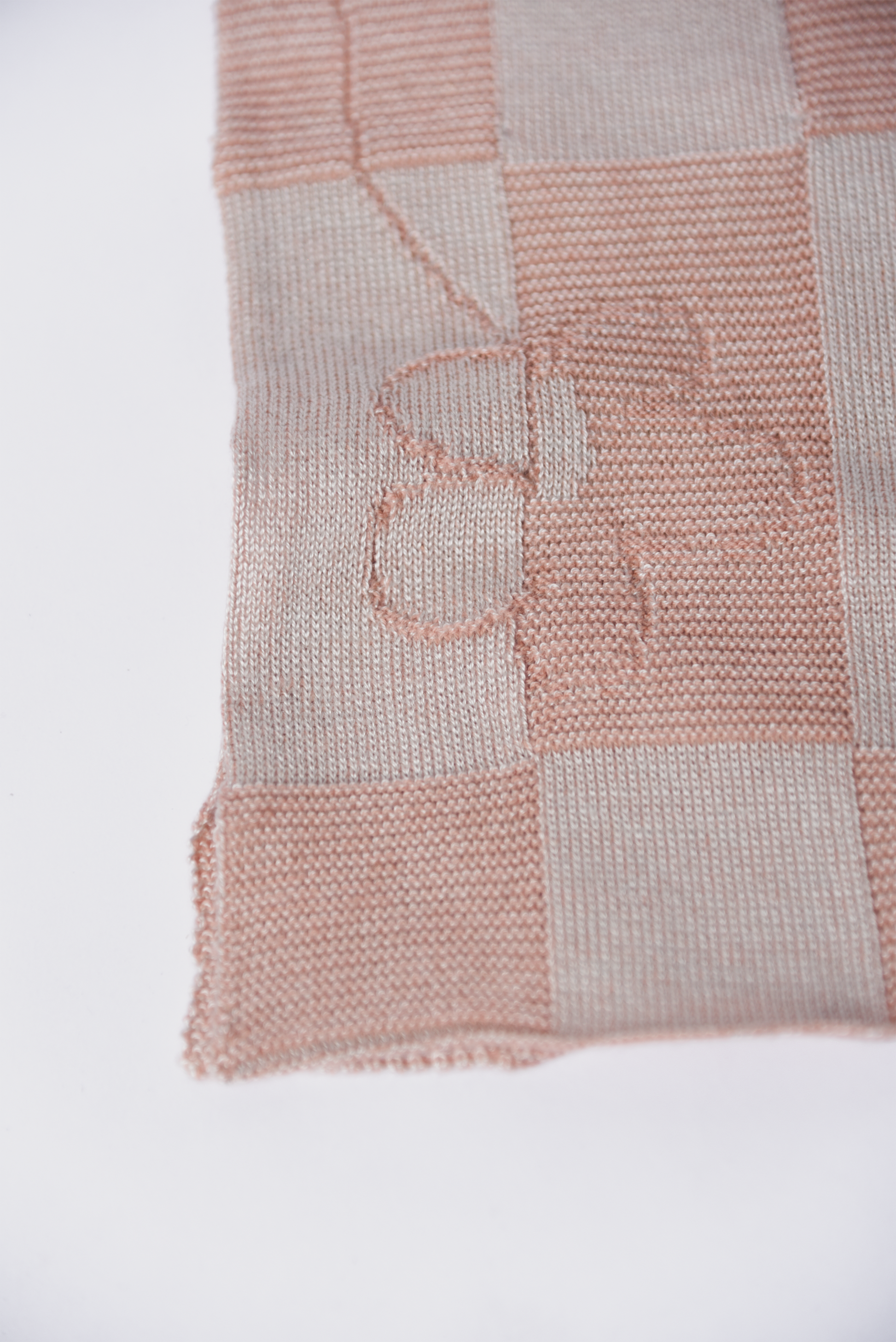 採用14針橫編針織機的規格織成,使用了plating的織造方式,使兩條異色的紗線色彩顯現在布料的正反面上,花紋則以布料的正反面交織呈現。
