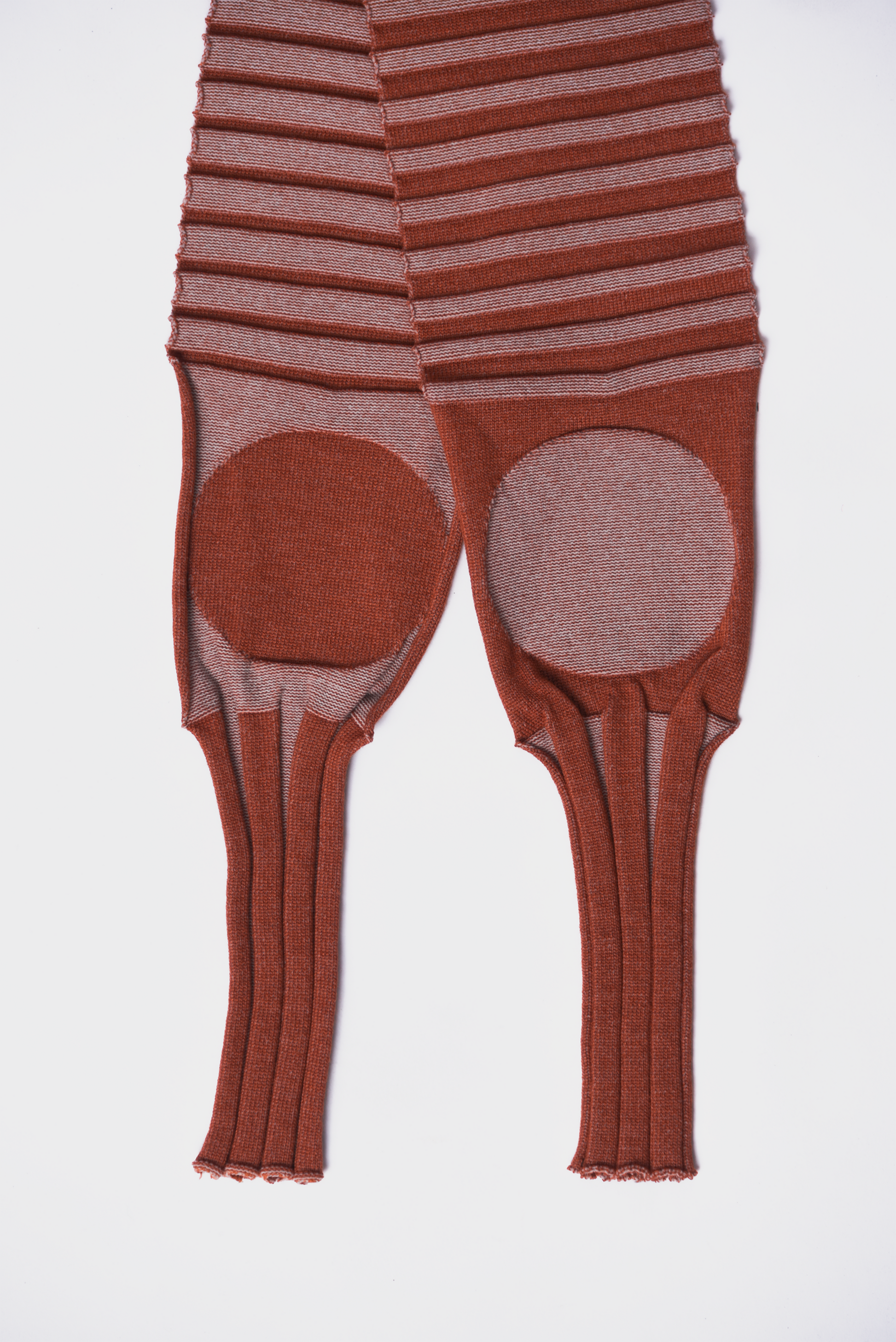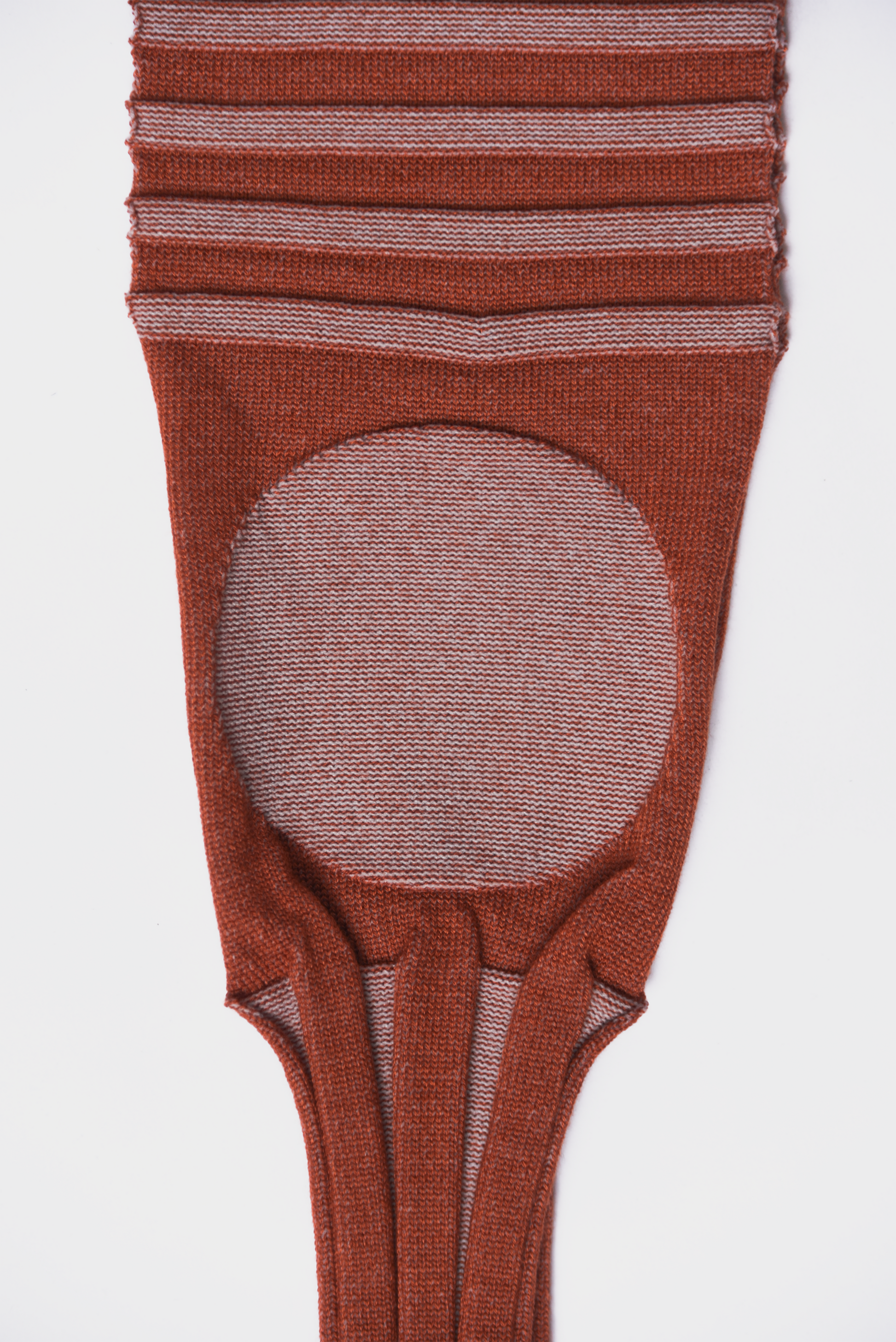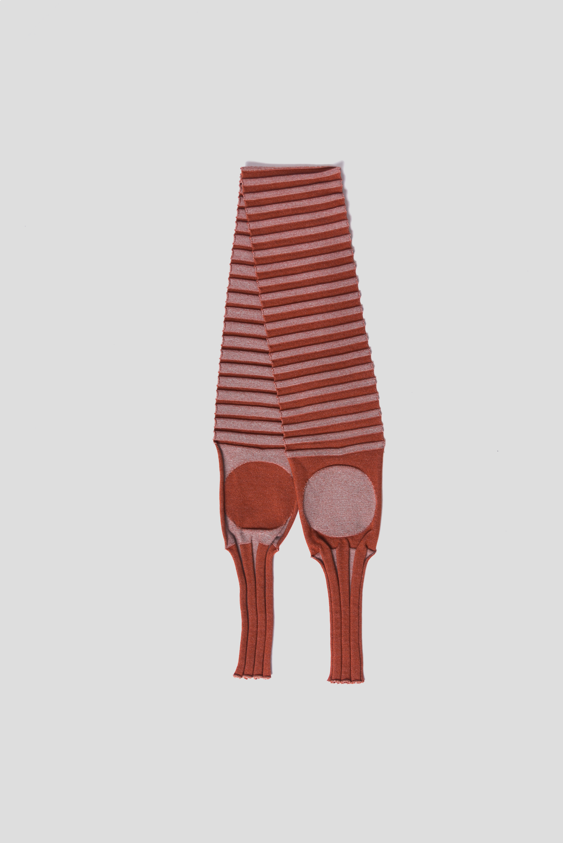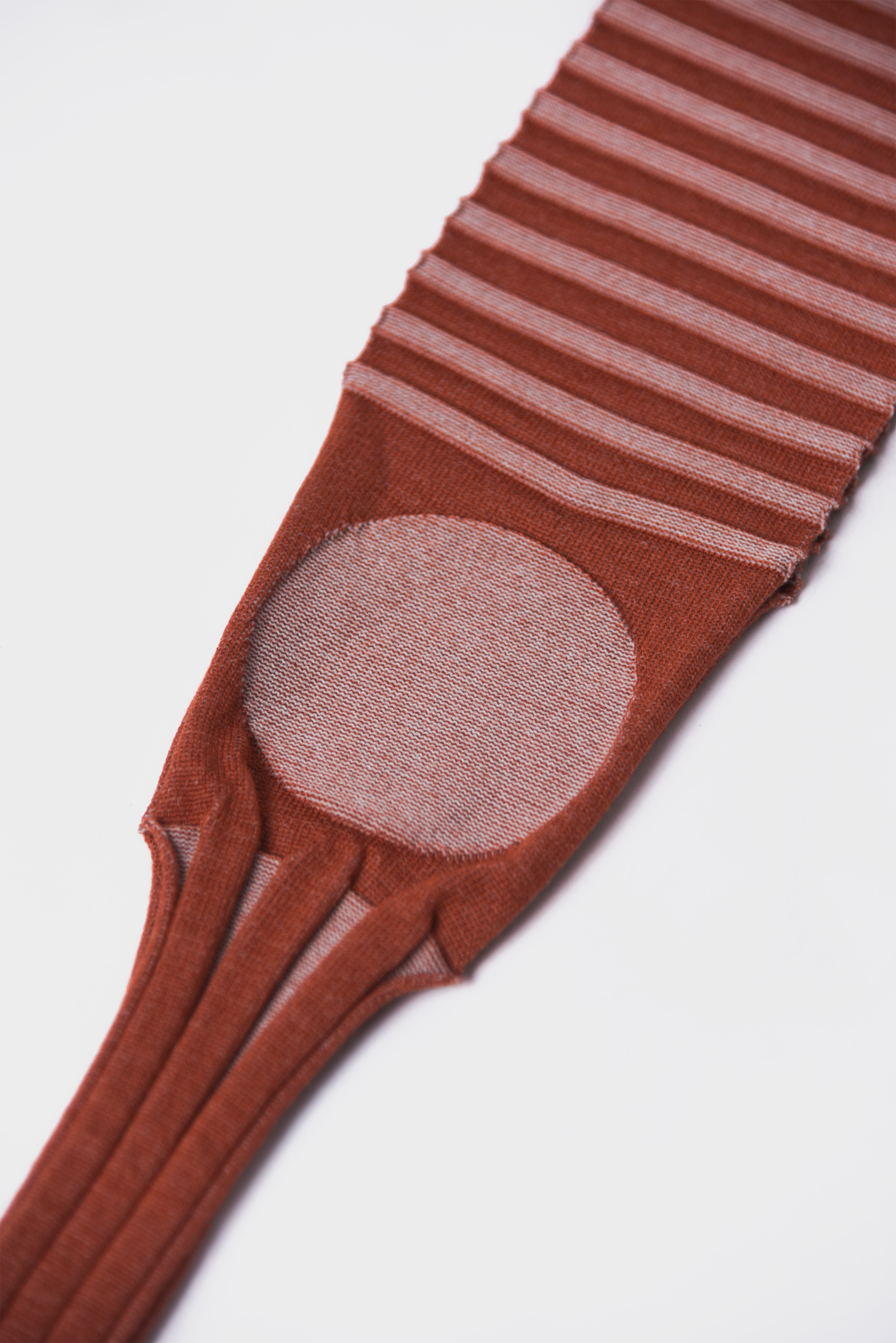 採用Lyocell的紗線製成,加入了蓬鬆的Nylon紗線,加厚了織出的布料。採用14針橫編針織機的規格織成,立體的紋理富有彈性。使用了plating的織造方式,使兩條異色的紗線色彩顯現在凹與凸的布料表面。收縮的兩端提供了搭配上的細節,適合當作領巾、髮帶、腰帶來使用。